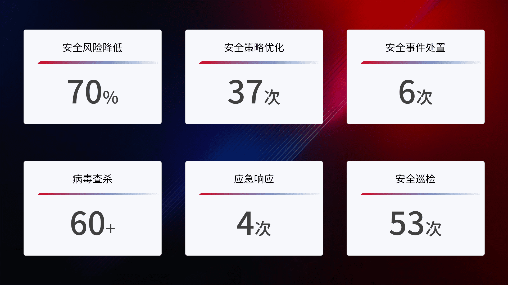 提供全面的安全事件报告体系,,,,包括处置报告、、周报、、、季度和年度总结,,,结合持续监控,,帮助客户深入了解网络安全状况。。。