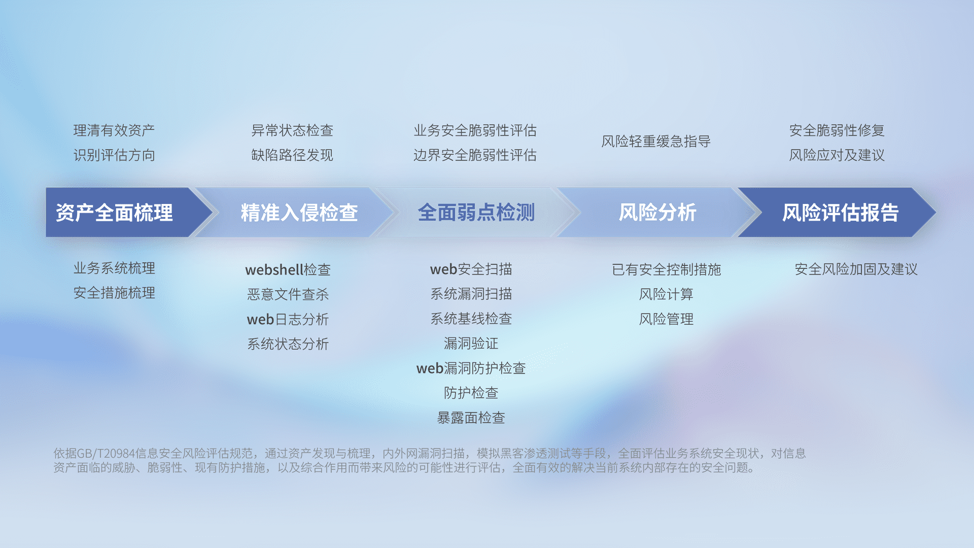 针对客户行业特性,,,,以专业的安全服务+多厂商联合解决方案提供专属的一站式安全管理服务,,,帮助客户全面感知网络空间威胁,,,,基于识别、、、检测、、、分析、、防护、、监测、、、、响应的服务理论模型,,,,从方案咨询、、、集成交付、、、评估验证、、、、优化加固、、运维运营,,,,致力于为客户提供完整的闭环管理式安全服务。。以实战经验为客户打造高抵御风险的安全体系,,,帮助客户发现威胁、、、对抗威胁、、、、处置威胁,,,,不断积累安全对抗能力,,持续保障数字化安全。。。